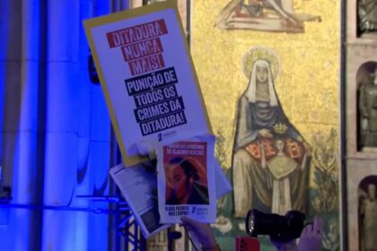 Cartaz no ato pede punição de todos os crimes da ditadura — (Foto: Reprodução)...