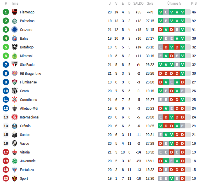 Veja a atual classificação da tabela do Brasileirão:
