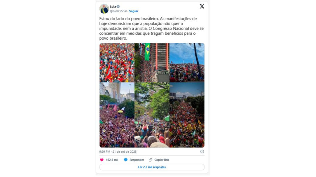 Durante os protestos, ecoaram gritos de “Sem anistia” e “Congresso inimigo do povo”. Manifestantes também criticaram a PEC da Blindagem, apelidada de PEC da Bandidagem por prever proteção judicial a deputados e senadores, e cobraram medidas como a isenção do IR e o fim da escala 6×1.