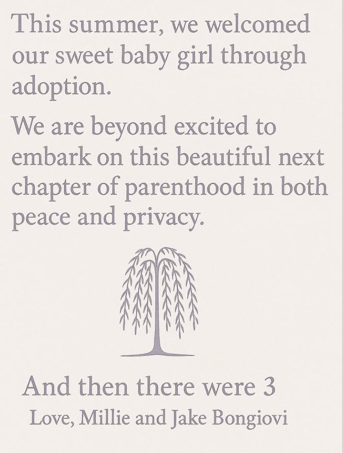A atriz Millie Bobby Brown, estrela da série Stranger Things, e o ator e modelo Jake Bongiovi, filho do cantor Jon Bon Jovi, anunciaram nesta quinta (21) que se tornaram pais de primeira viagem. O casal revelou que adotou uma bebê durante o verão, compartilhando a novidade em uma publicação conjunta no Instagram.