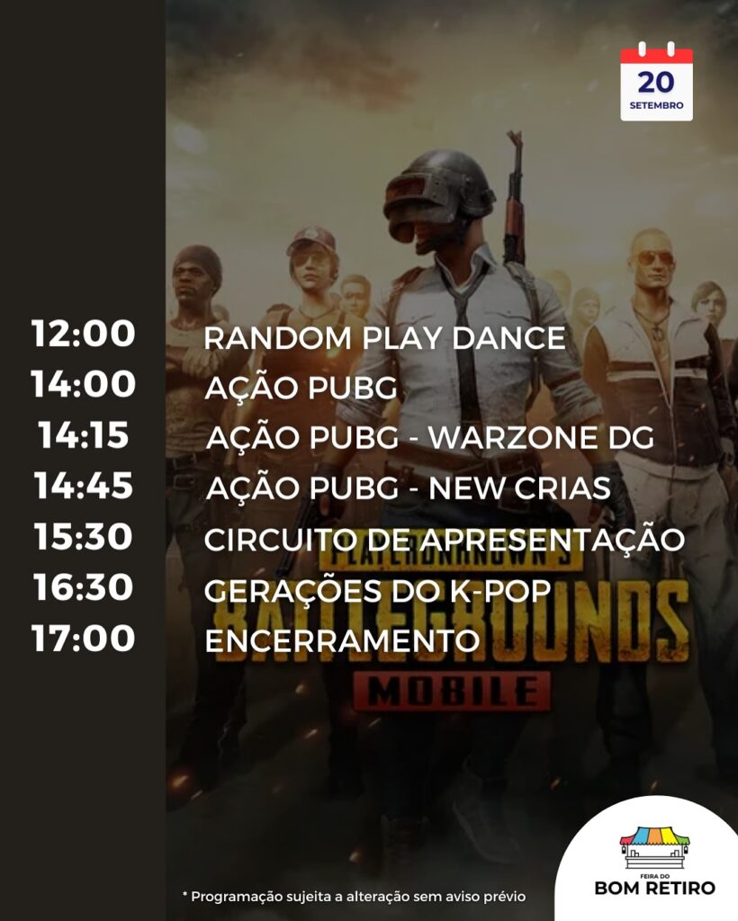 Neste sábado (20), a Feira do Bom Retiro receberá uma ação especial em parceria com PUBG MOBILE, um dos jogos mais populares da atualidade. A iniciativa reúne entretenimento, música e cultura pop, celebrando a colaboração do game com G-DRAGON, astro do K-pop. O evento ocorre na Rua Cônego Martins, das 10h às 17h, com entrada gratuita.