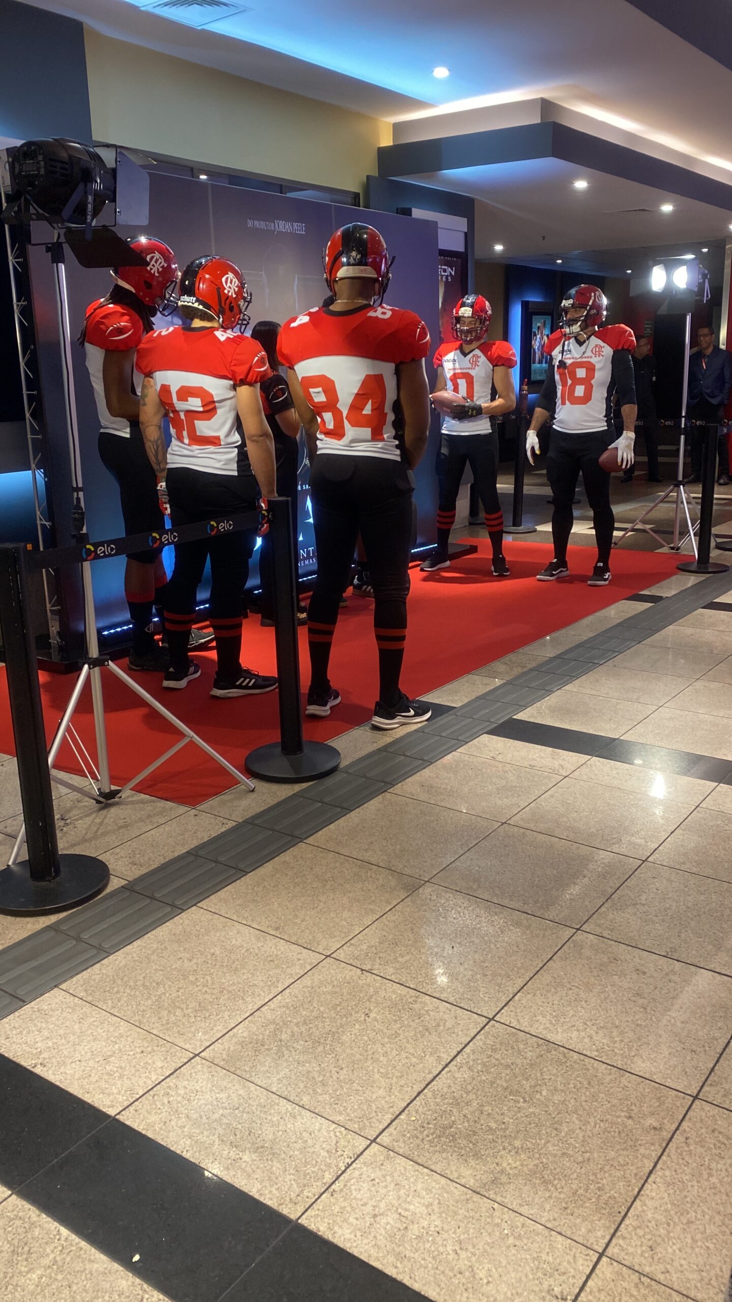 Depois do credenciamento, os convidados tinham duas opções: pegar pipoca com refrigerante e seguir para a sala, ou parar no espaço montado com o cartaz oficial do filme, onde o time de futebol americano Flamengo Imperadores estava à disposição para fotos e entrevistas. Aproveitei para registrar algumas imagens e sentir o clima descontraído antes da sessão. Via-se um burburinho a respeito do filme sobre o que ele traria dentro da temática terror e futebol americano, já que foi uma junção bem inusitada.