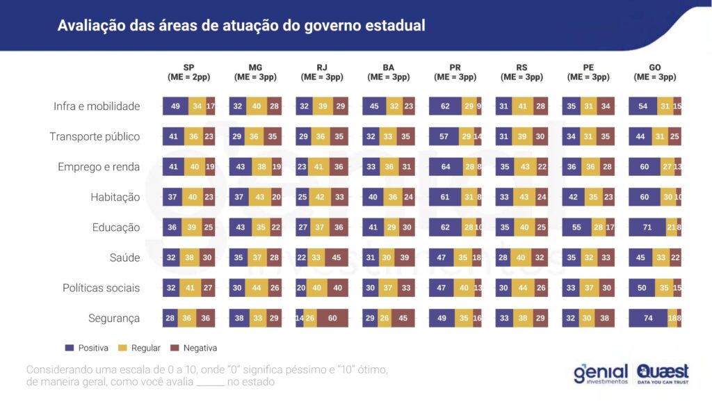 Em Goiás, o destaque de aprovação para as áreas de atuação foram em Segurança, com índice de 74%, e Educação, com 71%. Já as áreas como menor aprovação foram Saúde (45%) e Transporte Público (44%).