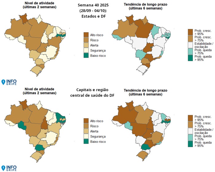 O Boletim divulgado revelou que sete das 27 unidades federativas apresentam incidência de SRAG em nível de alerta, risco ou alto risco (últimas duas semanas) com sinal de crescimento na tendência de longo prazo (últimas seis semanas) até a SE 41: Amazonas, Goiás, Pará, Rio de Janeiro, Roraima, Santa Catarina e Tocantins. Em Tocantins, ainda não há dados laboratoriais suficientes para determinar o vírus que tem impulsionado o crescimento de SRAG no estado.