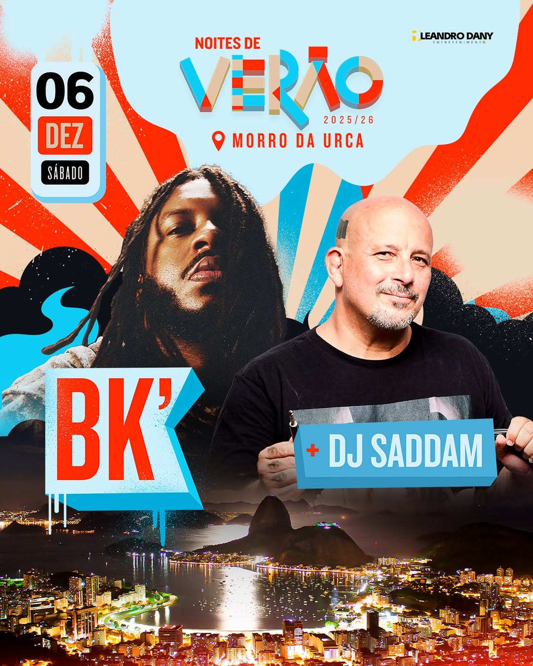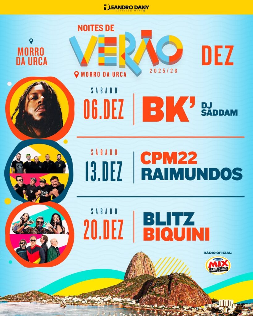 A primeira edição do projeto está marcada para o dia 6 de dezembro, quando o rapper BK’, um dos nomes mais relevantes da cena atual, se apresenta ao lado do DJ Saddam. A data marca a abertura oficial da programação.No sábado seguinte, 13 de dezembro, o Morro da Urca recebe o encontro entre duas bandas que marcaram o rock nacional nos anos 1990 e 2000: CPM 22, que celebra 30 anos de carreira, e Raimundos, conhecidos por clássicos que continuam presentes em festivais e turnês pelo país.Fechando o mês, 20 de dezembro traz outra vertente do rock brasileiro com Blitz e Biquini Cavadão, bandas que atravessam gerações e mantêm repertórios com forte presença no pop rock nacional.