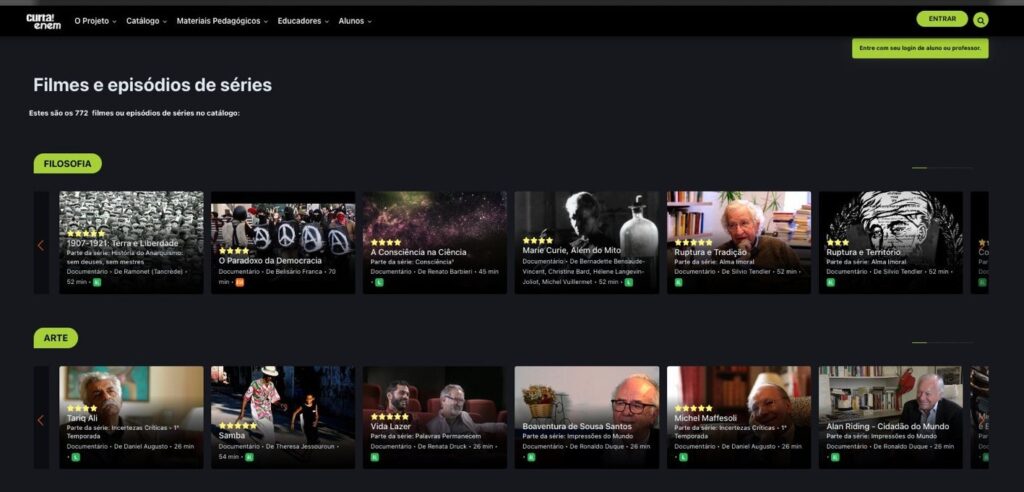 O catálogo de filmes inclui títulos clássicos como: “Ilha das Flores”, “Rio”, “Negro”, “Leopoldina – A Imperatriz do Brasil”, “Dopamina – Os efeitos das Redes Sociais no Cérebro”, “Favela é Moda” e “Carolina Maria de Jesus”. O conteúdo também é aberto para professores. Os filmes da plataforma Curta Enem servem também para dar apoio aos estudantes a pensarem nos temas de redação para o ENEM 2025.