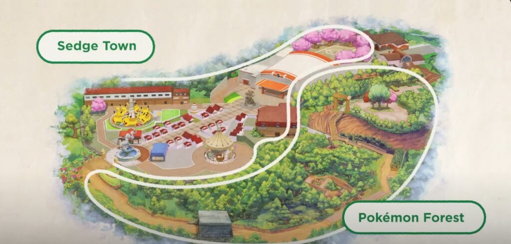 - Sedge Town: Representando a área urbana, esta seção do parque será inspirada nas cidades movimentadas do universo Pokémon. A proposta é oferecer cenários modernos onde os visitantes poderão explorar espaços temáticos, como centros Pokémon ou ginásios de batalha, e participar de atividades interativas com personagens e Pokémon em cenários urbanos.