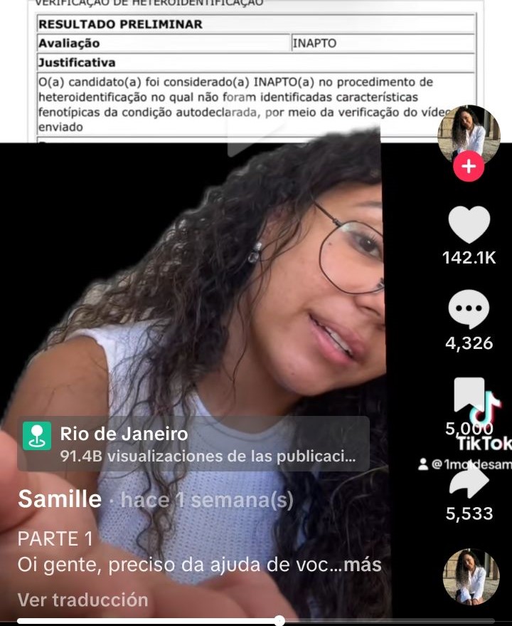 No dia 30/07/2025, Samille Ornelas publicou um vídeo em seu TikTok (@1moldesami) denunciando que o resultado preliminar da verificação de heteroidenficação prestada à instituição foi anteriormente avaliado como inapto. No mesmo registro, ela compartilha que até seu crânio foi medido como meio de identificação.